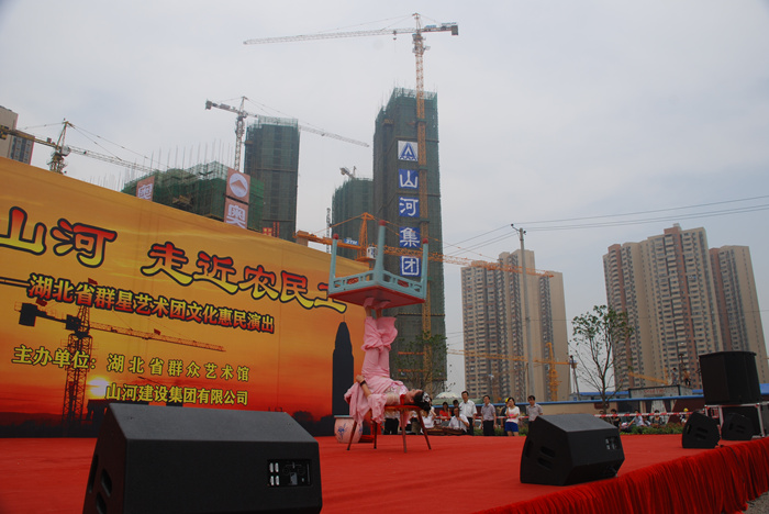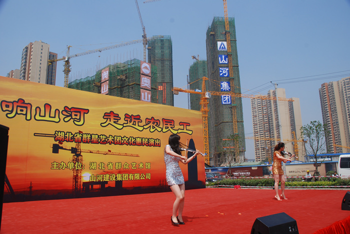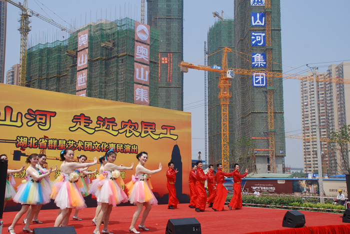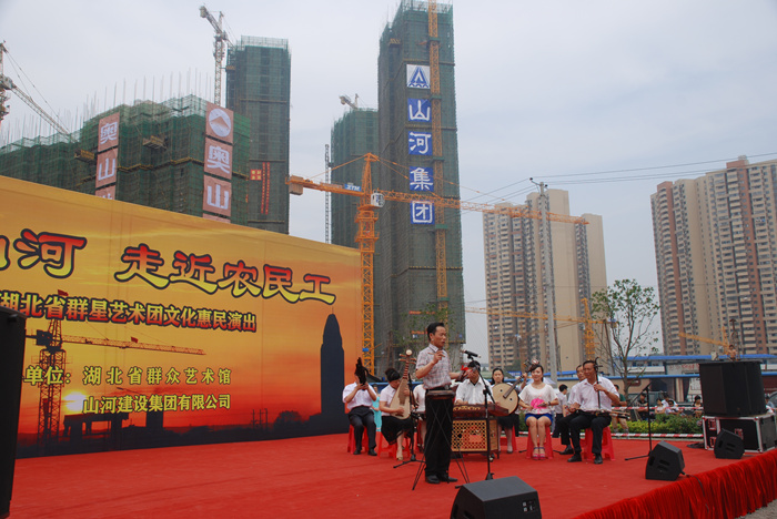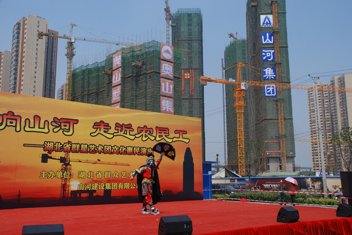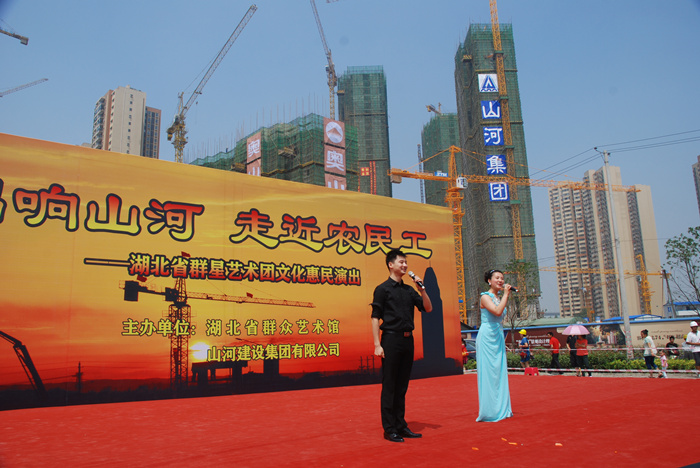 这次惠民演出是由湖北省群艺馆与山河集团共同举办,是山河集团关爱农民工的又一项举措。湖北公司副总经理柯为正在致辞中介绍说,作为房建施工总承包特级资质企业,山河集团已发展成为投资或控股东升建设、竹安设备、益鹏置业等22家子公司,集建筑产业、房地产业、投资业务于一体的企业集团。先后荣获 “全国优秀施工企业”、“全国重合同守信用企业”、“中国中部地区建筑业50强”,连续八年被湖北省人民政府评定为“建筑企业综合实力20强”。柯总指出,成绩的取得离不开所有曾经和正在为公司发展而默默奋斗的广大工友们。