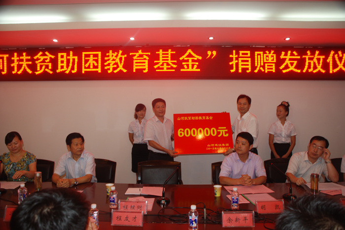 8月28日,革命老区黄冈市和团风县“山河扶贫助学”资助仪式先后举行,山河集团在两地共捐资140万元,作为2013年贫困学生救助资金。今年,是山河集团与黄冈市总工会、团风县教育局联手扶贫助学的第8年头。