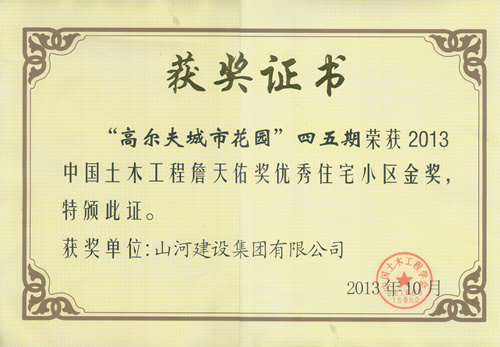 近日,由中国土木工程学会住宅工程指导工作委员会组织的2013年度“中国土木工程詹天佑优秀住宅小区”颁奖仪式在北京举行,由山河集团承建的 “武汉高尔夫城市花园四、五期”荣获“中国土木工程詹天佑奖优秀住宅小区金奖”。