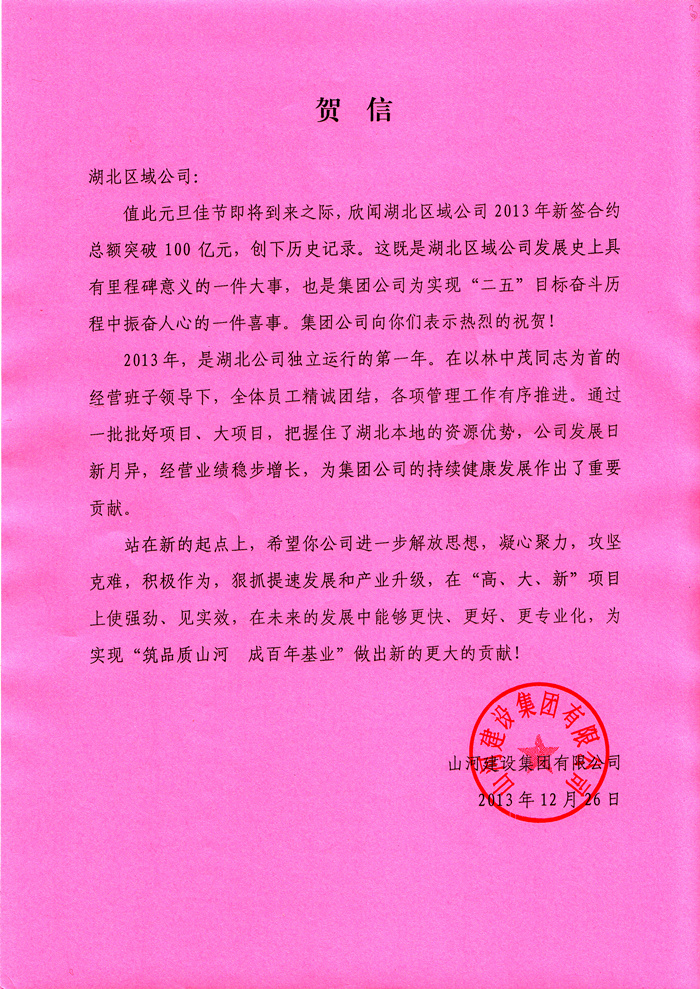 集团公司特向湖北区域公司发来贺信表示祝贺,并期待湖北区域公司为实现“筑品质山河 成百年基业”的企业愿景做出新的更大的贡献!