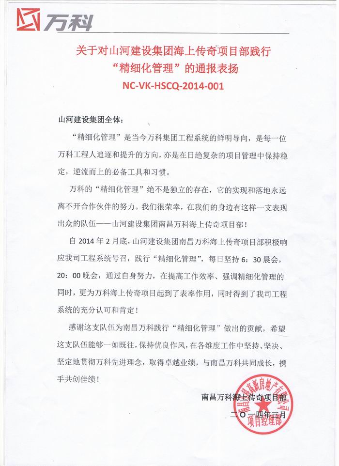 “感谢这支队伍为南昌万科践行精细化管理做出的贡献,希望这支队伍与南昌万科共同成长,携手共创佳绩!”近日,山河集团海上传奇项目部收到了一封来自集团战略合作伙伴――万科地产的表扬信。