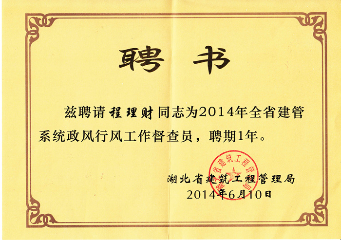 6月10日下午,2014年湖北省建筑工程管理局行风评议督查员聘请仪式暨工作座谈会在省建管局五楼会议室召开。集团公司董事长程理财同志被聘请为全省建管系统政风行风工作督查员,湖北省住房和城乡建设厅党组成员、建管局局长、党组书记张弘向15名督查员颁发了聘书。
