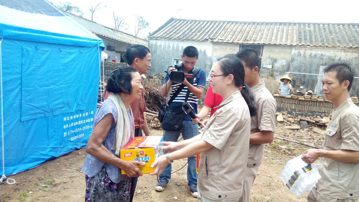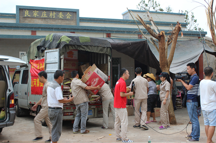 与此同时,海南各地都是众志成城的救灾场面,一方有难,八方支援。山河集团在开展自救的同时,心系灾民,当得知重灾区文昌部分村镇,由于交通偏僻,信息不畅,得不到及时救助,灾民的生活非常的艰难时,山河人心急如焚。山河集团已进驻海南6年,扎根海南、情系海南。在灾难面前,山河人勇于担当,自发的组织捐款10万余元,采购了几吨急需生活物资,如米、油、水、食品、药品等。7月26日,在海口热带播报记者的带领下,公司组织员工来到了一线灾区文昌市锦山镇良民村。 当我们来到该村时,村民已等待多时,看到我们的到来非常的激动。当时下着大雨,村民们顾不上遮盖自家的屋顶、收拾东西,都赶来搬运救灾物资,雨水、汗水、泪水流淌在脸上,感激之情流淌在心间。在村长的带领下,我们见到了村里的低保户年迈的阿婆,她老无所倚,几年前她儿子去逝了,几天前儿媳重病也去逝了,现只剩下小孙儿相依为命,台风又让这个本来很不幸的家庭受到重创,她们失去了仅有的一间住所,现寄住在只有几个平方的一个临时的帐篷里,当我们把米、油等物资送到阿婆的手中时,她热泪盈眶,紧握我们的双手,不停的道谢,看到老人的悲痛泪水,我们不禁心酸,泪水打湿了眼眶。我们鼓励她建立对生活的信心,同时也希望社会给予她更多的关爱,让她的晚年生活无忧。