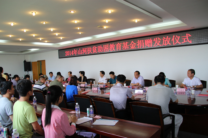 8月22日上午,2014年“山河集团扶贫助困教育基金”捐赠发放仪式在团风县政府七楼会议室举行,集团公司党委书记舒先厚及部分项目经理代表等参加活动。团风县“四大家”领导、县教育局领导、受助学生代表出席仪式。
