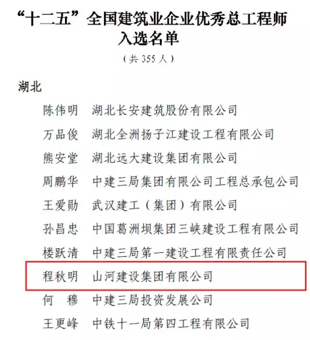 近日,山河集团总工程师程秋明入选中建协“十二五”全国建筑企业优秀总工程师。本次评选旨在表彰“十二五”以来为我国城乡建设做出突出贡献,并在科技进步和管理创新工作中成绩显著的建筑业企业优秀总工程师。