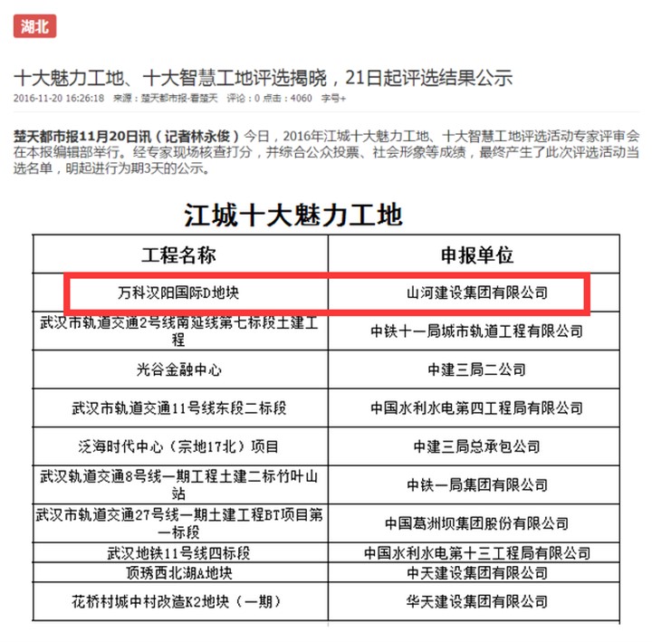 [湖北公司]山河集团”万科汉阳国际”项目部荣获江城十大魅力工地称号
