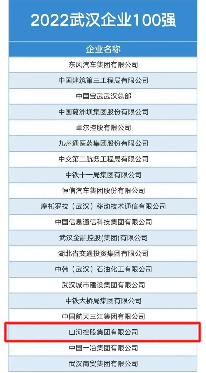 11月10日,《2022武汉企业100强、制造业企业100强、服务业企业100强分析报告》正式发布,山河集团再次上榜“武汉企业100强”,名列第18位。