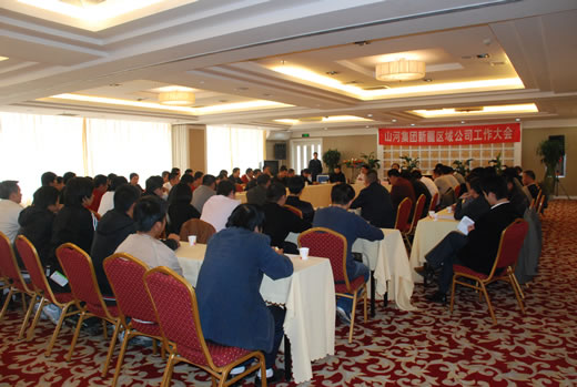 2008年10月19日,山河集团新疆区域市场发展研讨会在乌鲁木齐市锦泰源商务酒店隆重召开。出席本次会议的有集团公司董事长程理财、副总经理龚卫国、汪青,集团公司副总经理武汉帝豪房地产公司奎屯分公司总经理林金安、集团公司副总经理新疆分公司总经理童吉波、项目经理曾秋喜、孙乃军、徐汉江、程和平,人力资源部经理徐嘉鑫、市场部副经理黎乐、综合办公室副主任包P、尹四建,还有新疆本地的乌鲁木齐、奎屯、鄯善等地区在建工程项目经理、技术负责人、五大员等管理代表共计69人参加了本次会议。